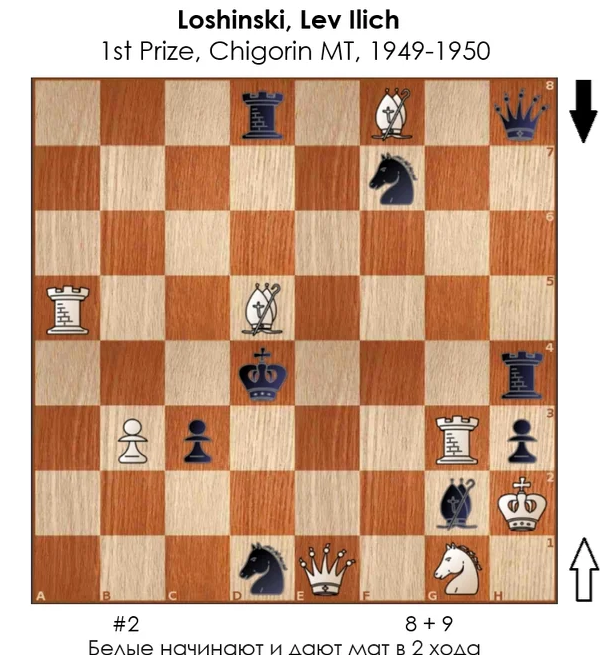 Двухходовая задача советского шахматного композитора Льва Ильича Лощинского (1913 - 1976), победившая на турнире памяти Михаила Ивановича Чигорина в 1950 году.